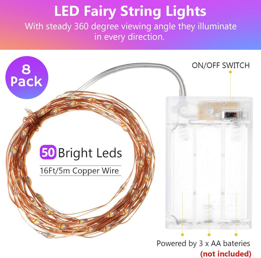 8 Pack Fairy Lights Battery Operated 16 ft 50 Led Mini Waterproof Fairy String Lights