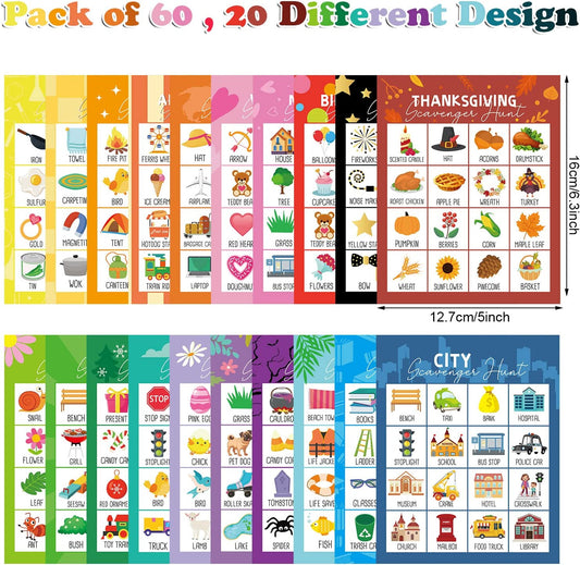 60 Pieces Scavenger Hunt Card for Kids and Family Themed Fun Scavenger Hunt Card for Family Parties Outdoor Activities