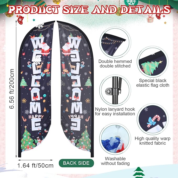 The bright and vibrant colors of these Christmas advertising flags make them highly noticeable from a distance. Flow shape makes them windproof and not curl, can be displayed clearly in the absence of wind.